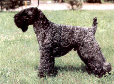 Celkový výzor. Typický kerrský modrý teriér má byt priamo stojaci, dobre skĺbený a proporcionálne stavaný pes, vyznačujúci sa správne vyvinutým a svalnatým telom. Hlava. Dobre vyvážená, dlhá, s nepatrným sklonom čela a plochou lebkou. Predná časť hlavy, čeľusť i sánka sú veľmi silné, hlboké a hrozivé; ňucháč je čierny, nosové otvory majú správne rozmery. Chrup. Zuby sú rovné, horné rezáky tesne presahujú dolné. Ďasná i podnebie sú tmavé. Oči. Podľa možnosti tmavé, malé až stredne veľké, s bystrým výrazom teriérov. Ušnice. Malé až prostredné, tvaru "V", nesené sú dopredu, ale nie tak vysoko ako pri iných plemenách teriérov. Krk. Hrubý a dlhý, zasadený do šikmých pliec. Trup. Krátko zviazaný, s dostatočnou hĺbkou hrudníka a dobre vyklenutými rebrami. Hrudník má byť priestranný. Horná línia je rovná. Hrudníkové končatiny. Plece je podľa možnosti ploché, s lakťami tesne pritlačenými k telu, či už pes stojí alebo je v činnosti. Nohy sú rovné, so silnými kosťami. Línia je rovná, ani príliš široká ani príliš úzka. Panvové končatiny. Veľké a dobre vyvinuté oblé kolená. Pätové kĺby sú tesne pri zemi a poskytujú dokonalú voľnosť pre akcie panvových končatín. Labky. Okrúhle a malé, pazúry na prstoch čierne. Chvost. Vysoko nasadený, predlžujúci dokonale priamy chrbát, nesený vzpriamene. Osrstenie. Mäkká, hodvábna, bohatá a vlnitá srsť. Zafarbenie. Hocijaký odtieň modrej farby s čiernymi končekmi alebo bez nich. Štencom sa povoľuje odtieň trieslovohnedej farby a takisto aj tmavá farba až do veku 18 mesiacov. Malá biela škvrnka by nemala ovplyvniť hodnotenie. Chyby. Tvrdá srsť alebo srsť ako vlna. Úplne čierna farba po 18 mesiacoch. Výška vyše 48 cm. Hrčovité lícne kosti, predhryz alebo silný podhryz. Ušnice v tvare ružových lupienkov. Končitá predná časť hlavy. Svetlo zafarbené alebo plné oči. Kaprí alebo preliačený chrbát. Úzka, chodúľovitá akcia panvových končatín alebo kravský postoj.